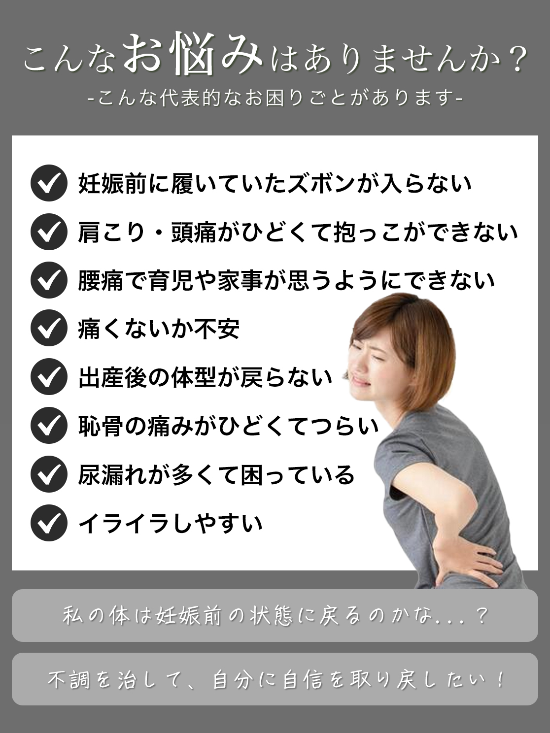 産後のママさんのお体の状態や不調、悩みは本当に様々なものがあります。