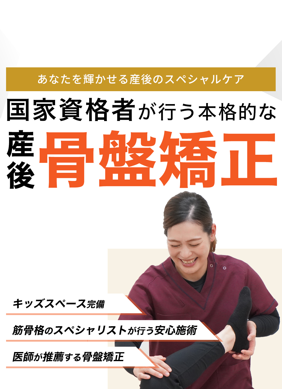 産後の不調や悩みに詳しいので安心して任せられる整骨院です。運動から栄養指導まで、他では受けることができない骨盤矯正を行っています。10年後も健康で美しいママでいられるために欠かせません。